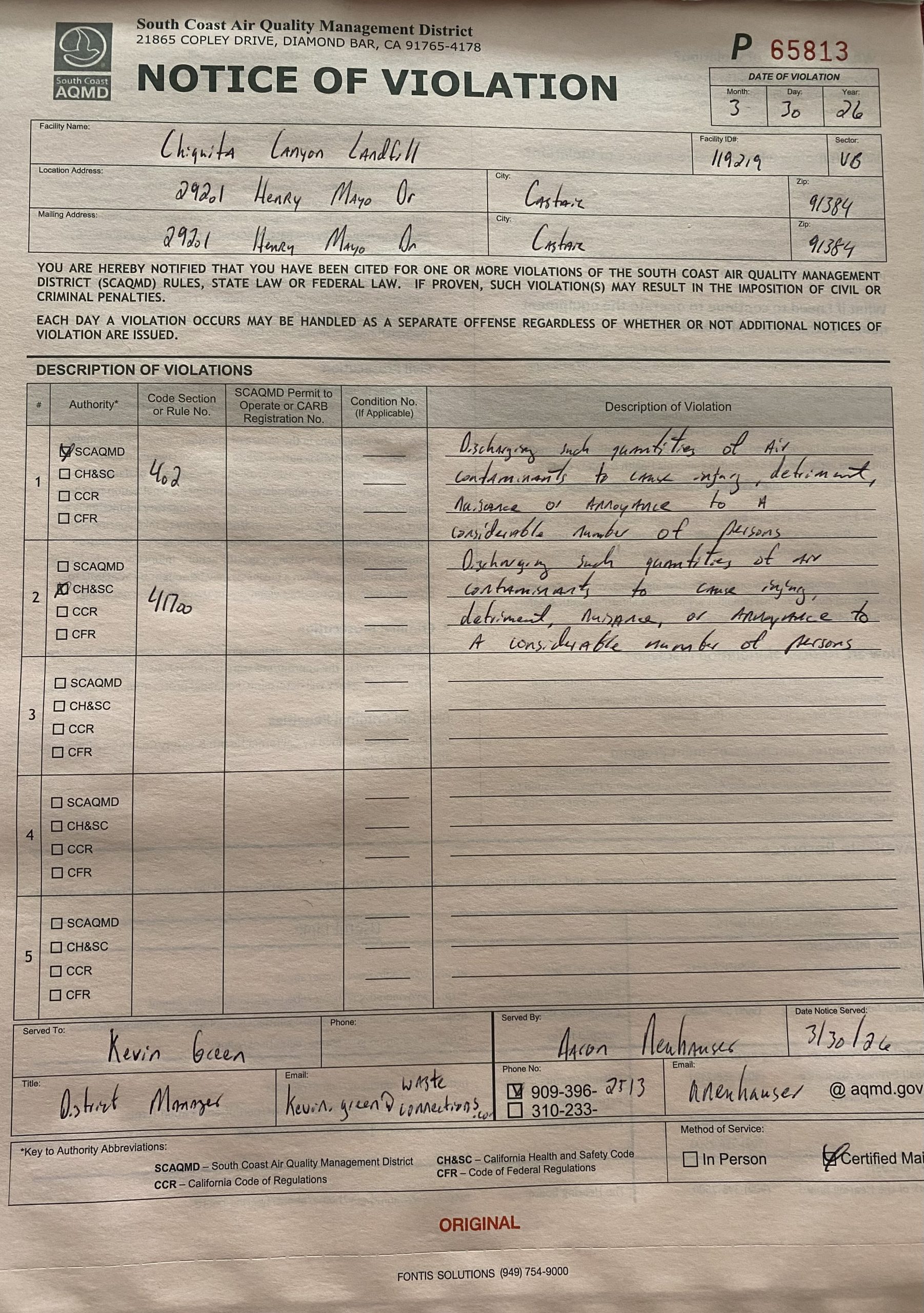 Chiquita Canyon Landfill has a strong reputation within the industry for operating a clean and safe facility. Notices of Violation (NOV) can be issued by a permitting agency and are meant to allow the landfill to make any necessary corrective actions.